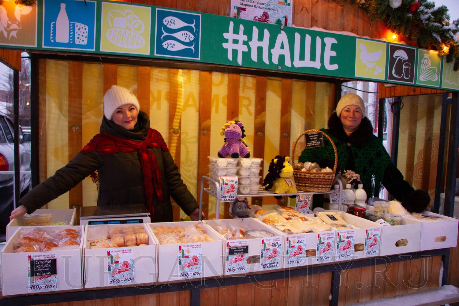 КФХ «Усадьба» Юргамышского муниципального округа представляет Леонид Пысин, который предлагает большой ассортимент продукции - замороженную местную ягоду – малину, крыжовник, разные виды смородины, рябину черноплодную, тушенку, варенье из тыквы и разные виды меда, курицу. Даже овес и лен заготовил фермер для желающих поправить свое здоровье. «Участвуем в различных ярмарках, на Рожественской работаем каждый год. Горожане покупают, уступаем, конечно, и продаем дешевле. Рождественская ярмарка для души. Нам нравится накануне Нового года радовать горожан экологически чистой продукцией», - улыбается Леонид Пысин.