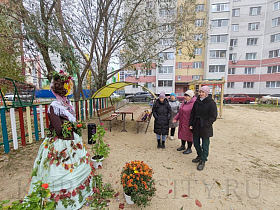 В ТОС «Заозёрный-7» жители свою ростовую куклу изготовили из прочного металлического каркаса, одели её в осенний наряд декорированный листьями.