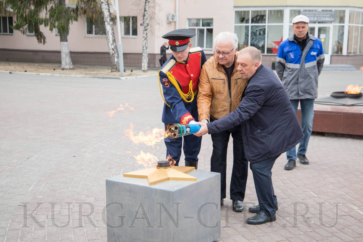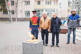 Сегодня, 20 апреля, в Кургане проводится техническое обслуживание Вечного огня на мемориальном комплексе на Аллее Славы. Это ежегодное мероприятие, которое организуют специалисты АО «Газпром газораспределение Курган» накануне Дня Победы. На время проведения профилактических работ Вечный огонь был перенесен на временную горелку с помощью специального факела. В этом году в церемонии переноса приняли участие председатель Курганского городского совета ветеранов Владимир Дударев, директор АО «Газпром газораспределение Курган» Олег Попов и кадет школы №75 Илья Сотников.